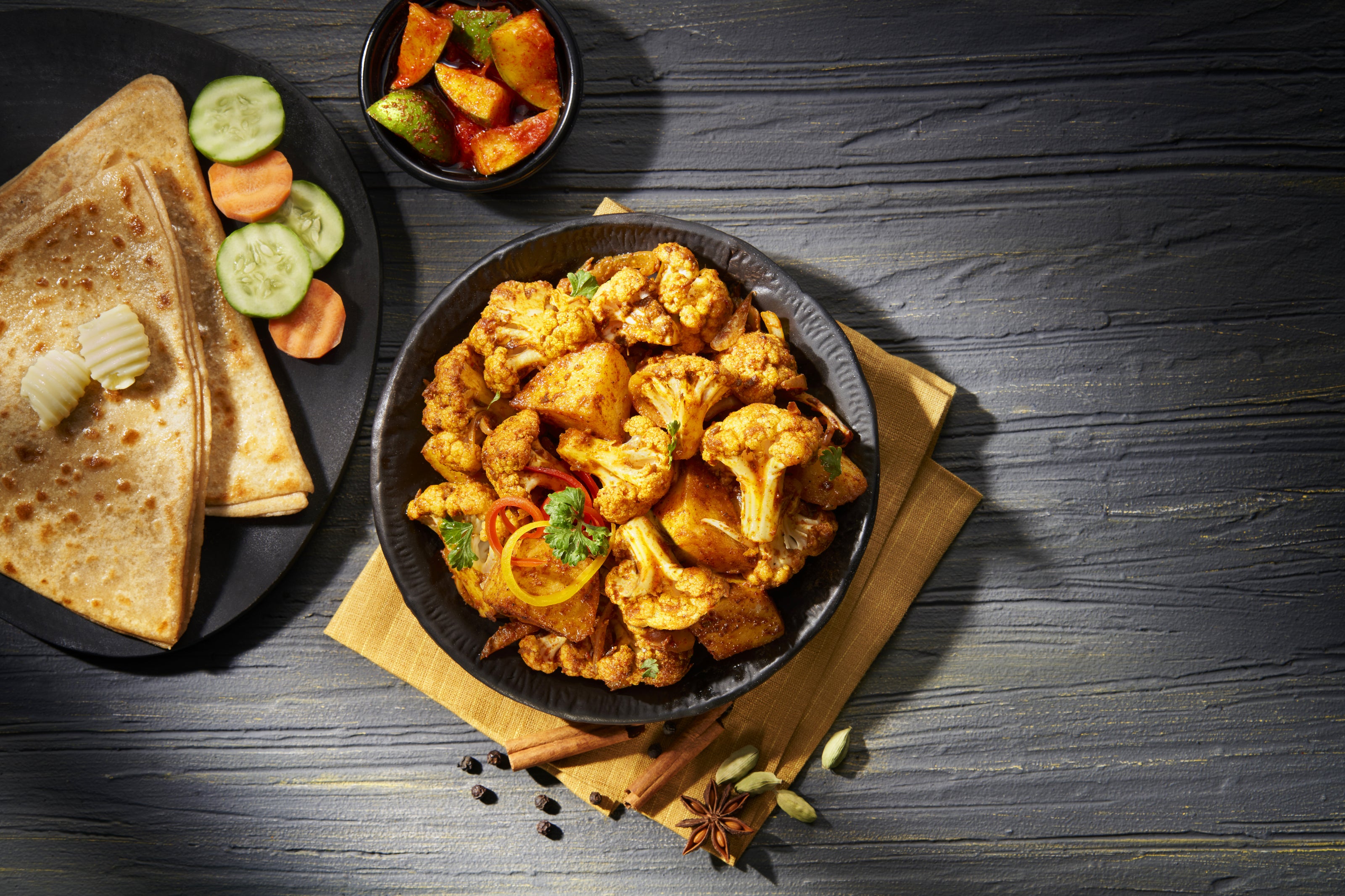 Step 1-Â Heat the oil. Add cumin seeds and stir till they turn golden brown. Then add ginger- garlic paste and cook until it turns brown. Then add 2 large potatoes with cauliflower cut into florets.