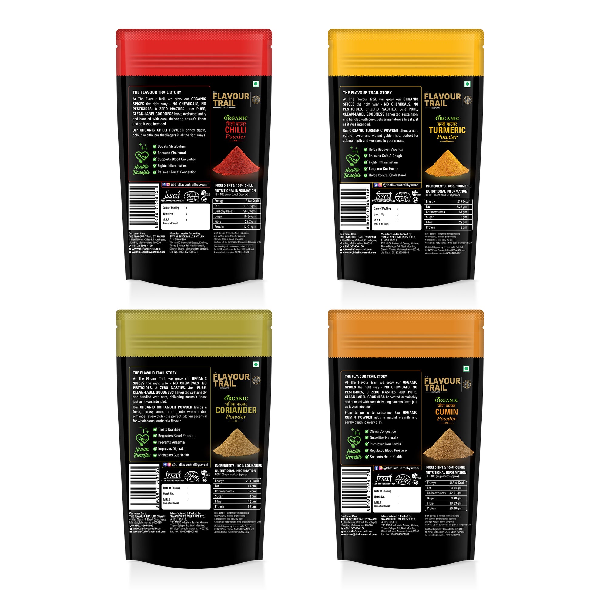 Kitchen Staple Organic Powders - Chilli + Turmeric + Coriander + Cumin